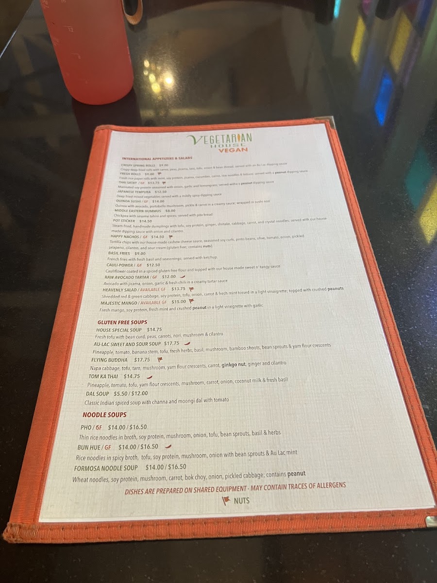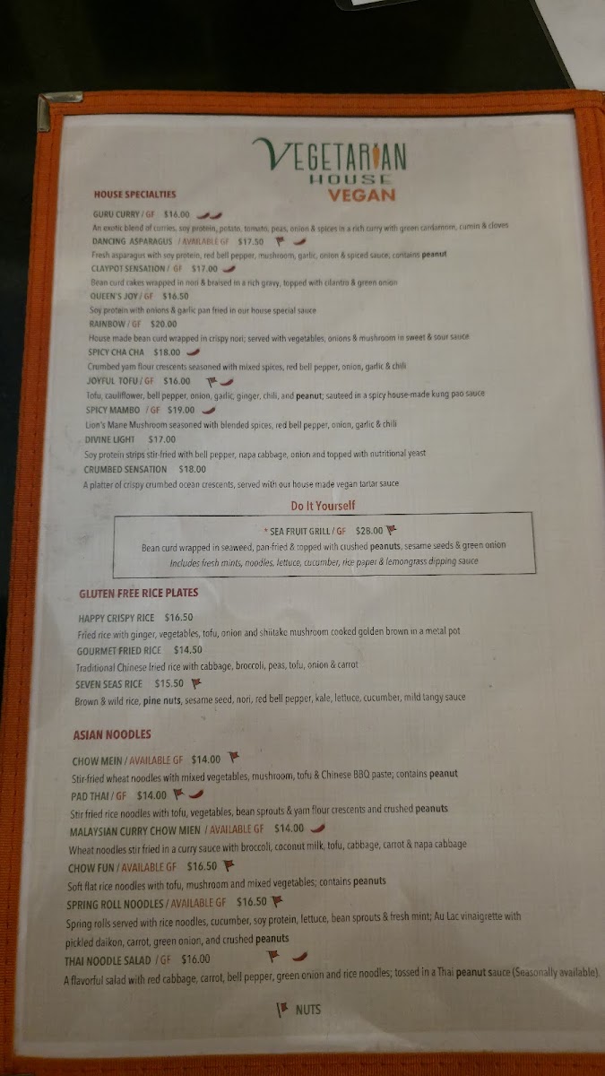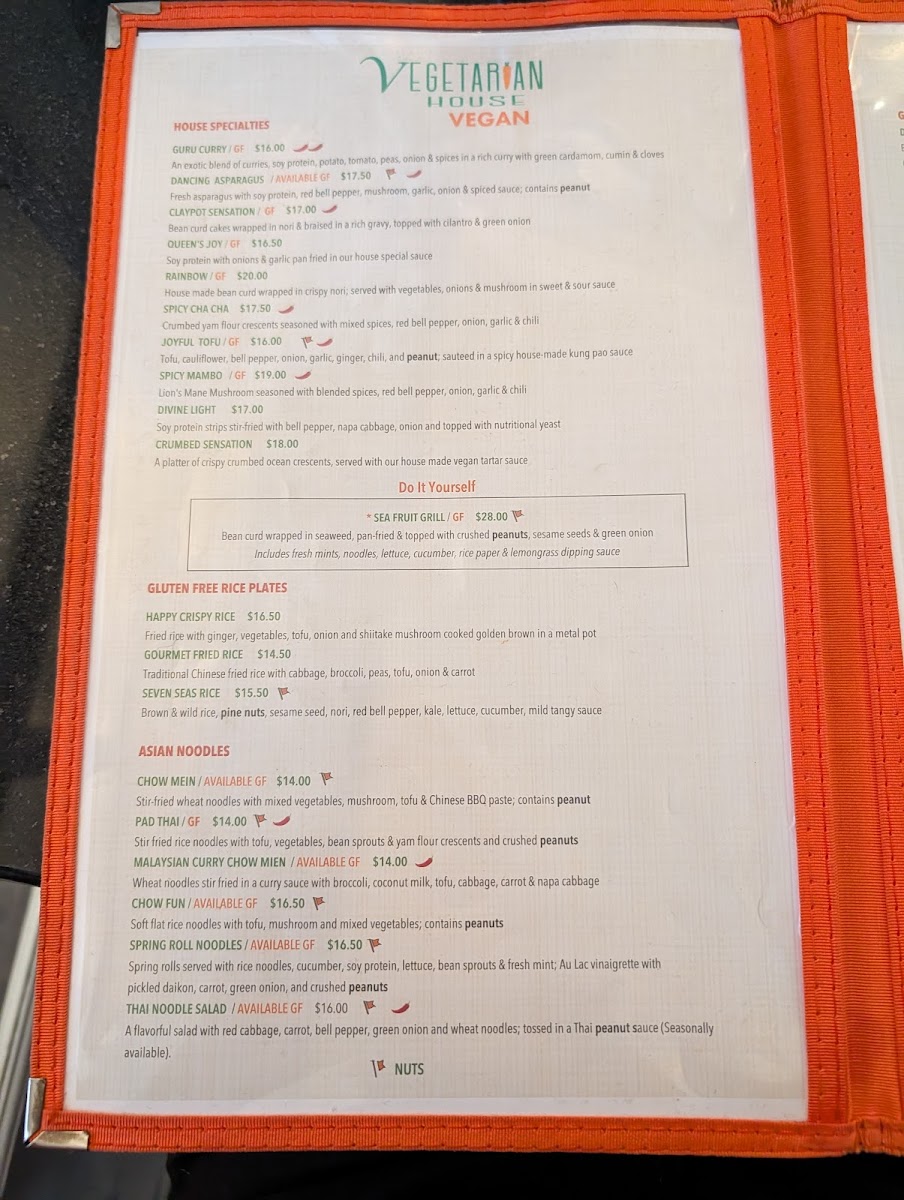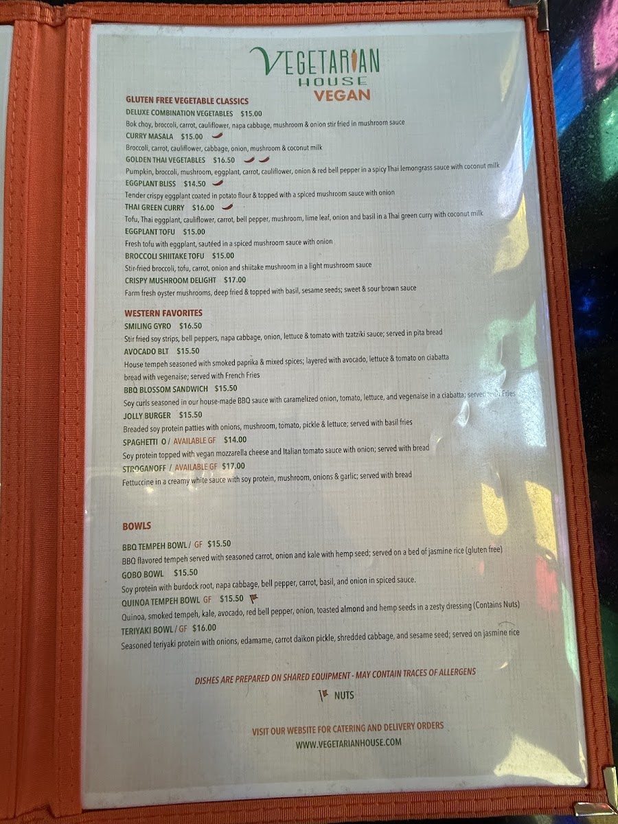 The menu is suitable for casual dining and takeout, with weekend dine-in service and weekday takeout availability. The range of items supports various meal occasions from light bites and appetizers to main courses, appealing to those seeking plant-based Asian fusion cuisine with gluten-free options.